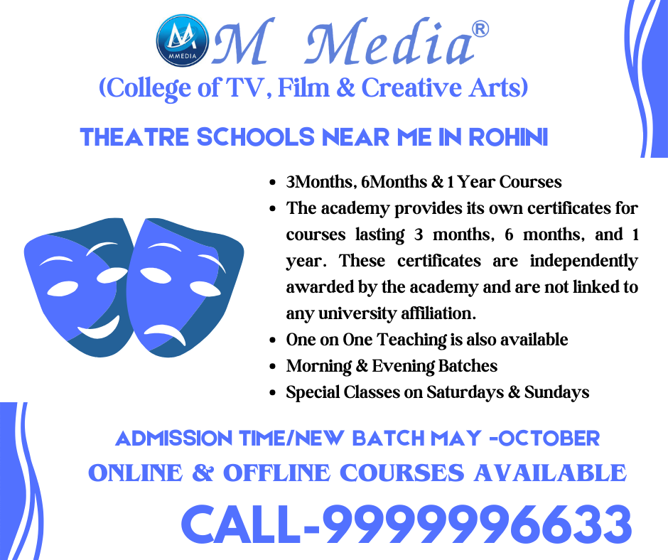Theatre Schools Near Me In Rohini are specialised educational institutions that provide training in various aspects of the performing arts, including acting, directing, stage management, scriptwriting, and technical production. These schools offer a structured environment where aspiring actors, directors, and theatre professionals can hone their craft under the guidance of experienced mentors and trainers.